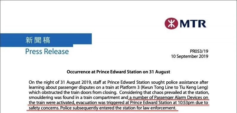 5/ #MTR staff reported the incident to the police at 22:45 and an evacuation was triggered at Prince Edward station at 22:53.