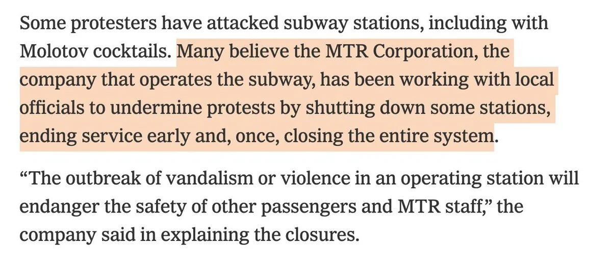 Another egregiously bad Hong Kong piece from the NYT. What the hell is going on? The chief reason the MTR is a target is that police attacked passengers on 8/31 and have been a ubiquitous presence since. There is a widespread belief that the MTR is covering up police killings.