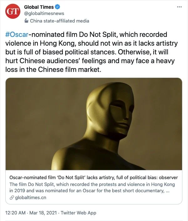 2/ Lors de son annonce, “Do Not Split” a été nominé comme Meilleur Documentaire court aux Oscars, le Global Times (média gouvernemental Chinois) s’est offusqué et a attaqué le festival, l’annulation de la projection du film n’est donc pas si surprenante.