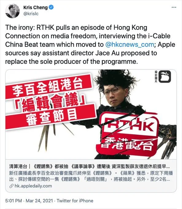 5/ Avec autant de programmes à censurer et supprimer, on ne peut s’étonner que le nouveau directeur de RTHK ait été trop occupé pour rencontrer ses employés et expliquer ses décisions “éditoriales”.