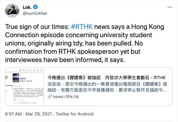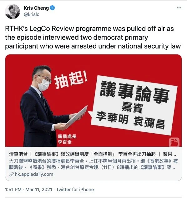 4/ Depuis que le bureaucrate Pak-Chuen Patrick Li pris la tête de RTHK le 1er Mars, le média public a été la cible frontale de toutes les attaques. Certains programmes étant alors abruptement supprimé, accusés de porter des discours “politiquement incorrects”.