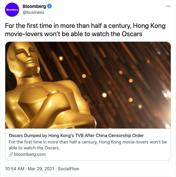 1/ Aujourd’hui nous avons appris que la cérémonie des Oscars ne sera pas diffusée cette année parce qu’elle a été jugée comme “heurtant la sensibilité du peuple Chinois” et que le Hong Kong International Film Festival a annulé la projection d’un film racontant l’histoire de flics corrompus. Deux nouveaux incidents à ajouter à une déjà longue liste d’actes de censure.