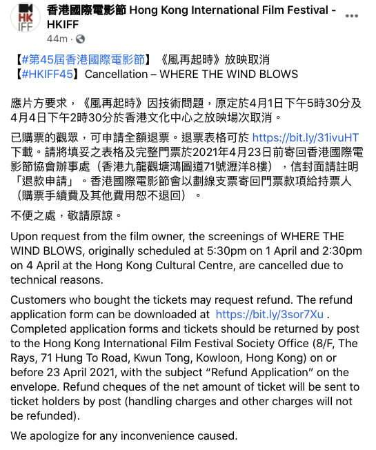 3/ L’annulation de la projection de “Where the Wind Blows” au HKIFF est cependant plus problématique et montre que les films grands public qui n’ont pas l’approbation directe du département de Censure Chinois peuvent désormais être désormais condamné sans même recevoir un procès en bonne et due forme à Hong Kong.