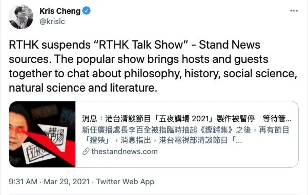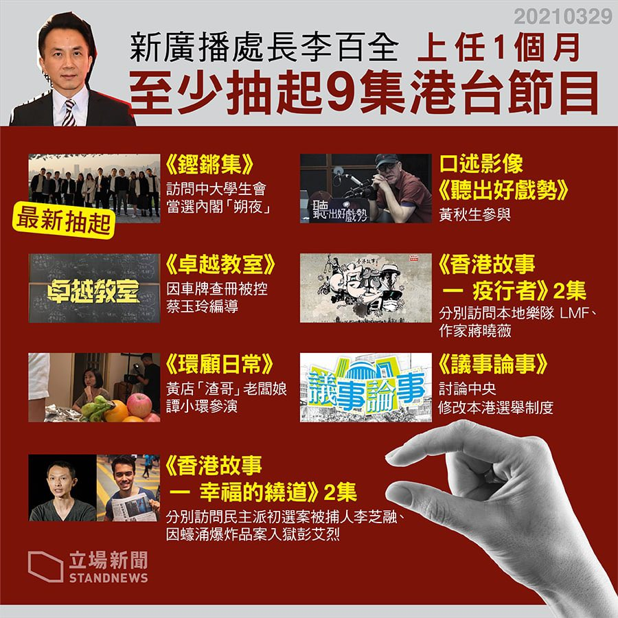 7/ Selon StandNews, 9 émissions de RTHK ont déjà été déprogrammées cepuis que Patrick Li a pris le poste de directeur de diffusion.