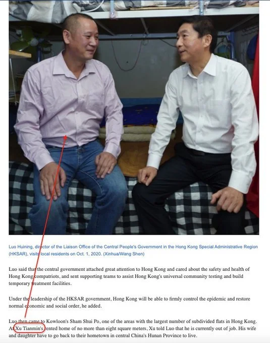 2/ Sur cette photo, on peut clairement voir que Xu est interviewé par Beijing Daily, au lieu d’en être le représentant. Donc, qui est Tianmin Xu ? Pourquoi est-il “l’élu” recevant une visite à domicile de Huining Luo, le de-facto leader de Hong Kong ?