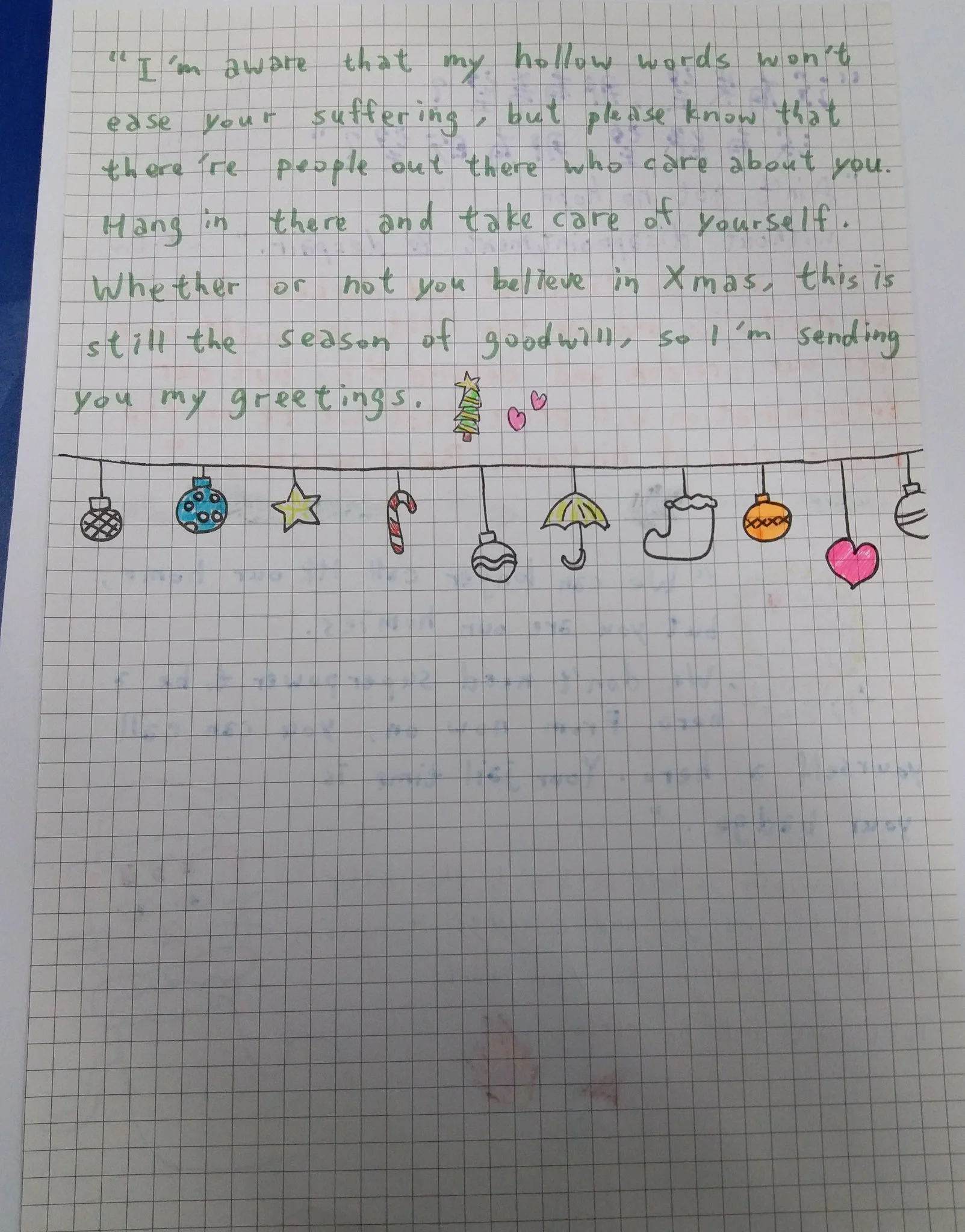 J’ai bien conscience que mes simples mots n’effaceront pas vos souffrances, mais n’oubliez pas que des gens là bas dehors vous soutiennent et pensent à vous. Tenez bon et prenez soin de vous. Que vous croyiez ou non en Noël, c’est toujours la saison de la bonté et je vous envoie tout mes voeux.